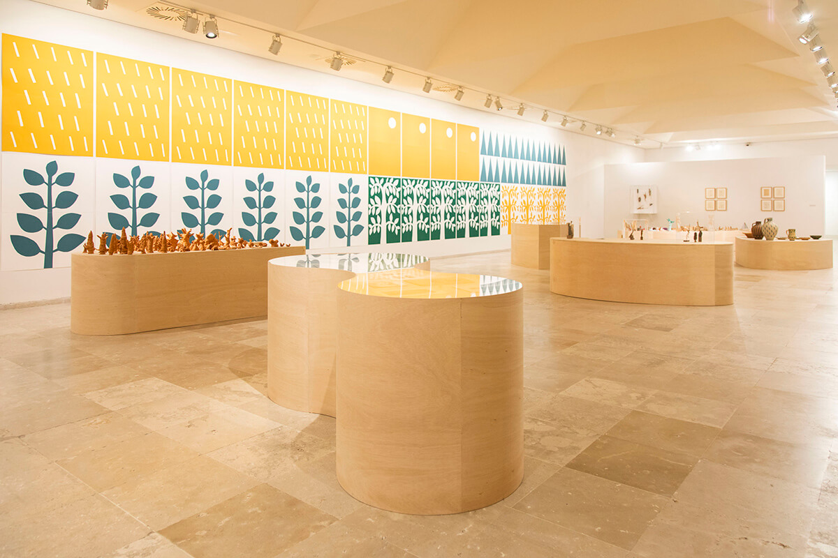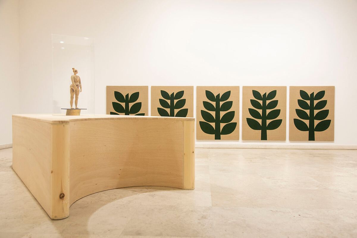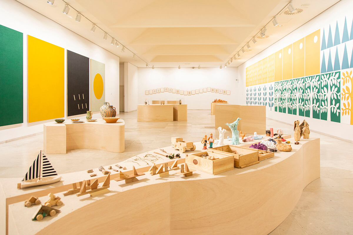 El soporte expositivo diseñado responde a las formas de los “Arsintes”: piezas de madera colocadas sobre la superficie de las salas que organizan el espacio como si de un juego se tratara, generando recorridos, hitos y escondites, configurando los soportes de las obras de Angel Ferrant y de Antonio Ballester.